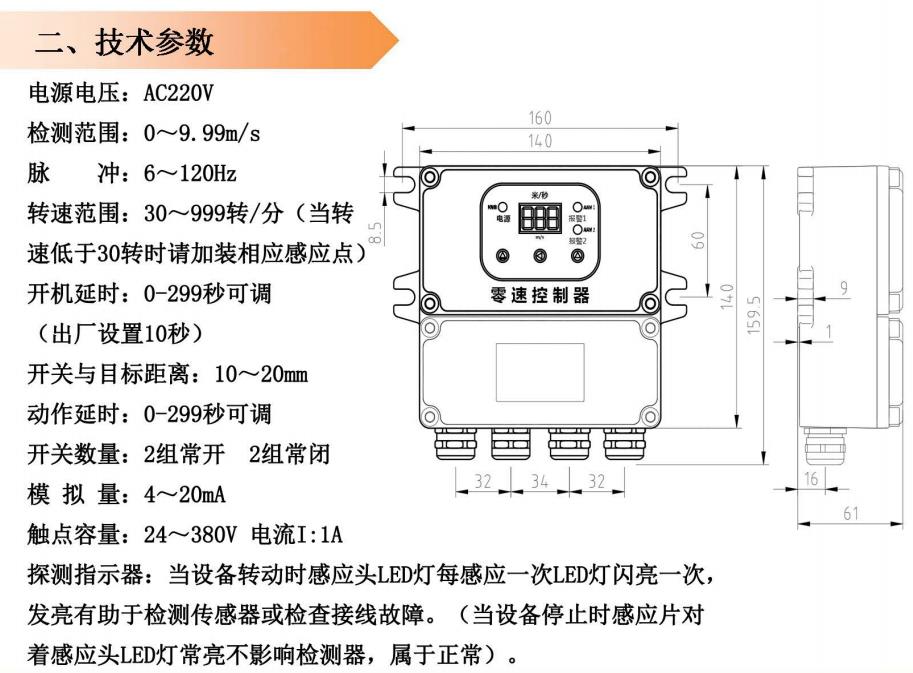 該檢測器是一種經濟、可靠性強、對軸轉速及其他旋轉裝置簡單通用的檢測裝置,當檢測到目前信號低于或高于正常轉速范圍,開關輸出兩組開關信號,以供報警或停機。無運動部件、無磨損、安全壽命長,一體化結構,集中的控制裝置,設定或故障檢修簡單。外殼采用防水、防塵的殼體,可直接安裝在惡劣環境中使用。
